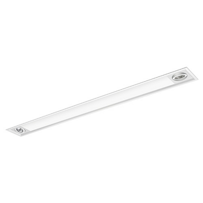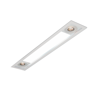 Calha de metal branco embutido para 02 lâmpadas T8 e 02 lâmpadas dicroicas. Material: Alumínio e Acrílico Medida: 93cm X 15.5cm 02 Soquetes para lâmpadas T8 02 Soquetes para lâmpada Dicroica GU10 Não acompanha lâmpada Tensão: 110/220V Peso: 1.7kg