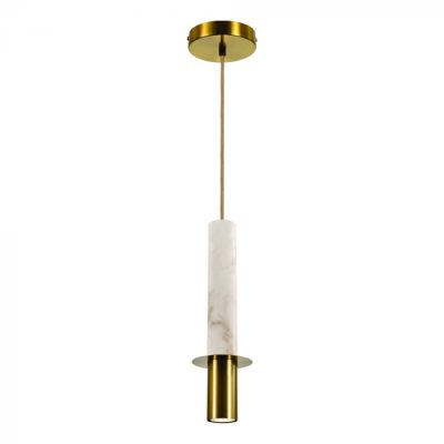 Pendente Tubo de Metal Dourado com Mármore Branco Marca: Sindora Ref: 49517 Material: Metal, Mármore Cor: Dourado, branco Medidas: (D) 12cm (A) 35cm Lâmpada: 1XGU10 NÃO ACOMPANHA LÂMPADA