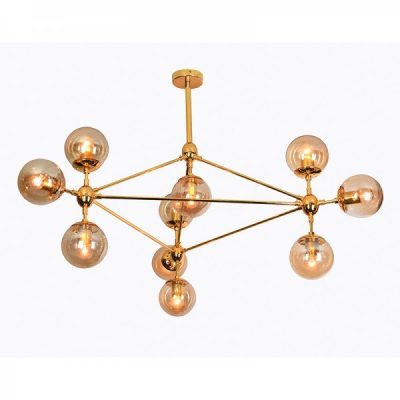 Lindo pendente de metal dourado com bolas de vidros na tonalidade âmbar. Seu design original torna os ambientes modernos e cheios de personalidade, ideal para sala de jantar e de estar.