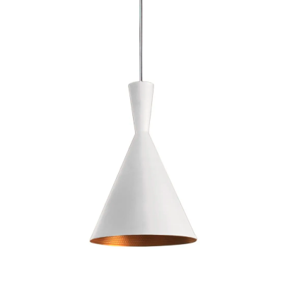 Marca: Taschibra Ref: TD 902 Pendente Blu Cone Chines Material: Alumínio Branco e Dourado Medida: Ø185mm X A:400mm Cabo: 880mm 01 Soquete para lâmpada E27 Não acompanha lâmpada Tensão: 110/220V Peso: 500g