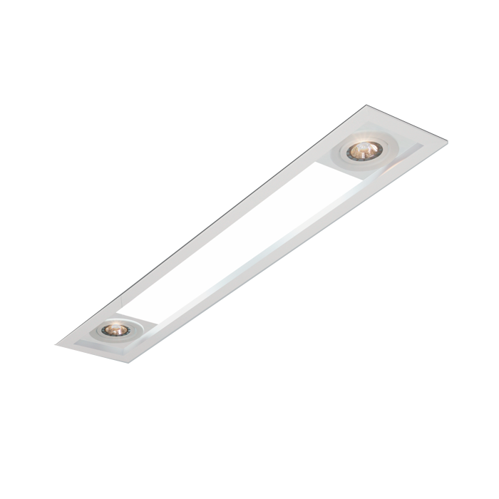 Calha de metal branco embutido para 02 lâmpadas T8 ou T5 e 02 lâmpadas dicroicas.