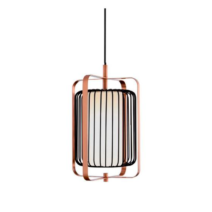 Pendente aramado preto com estrutura metálica em cobre e mais cúpula de tecido, ideal para você que deseja inovar no visual do seu ambiente.