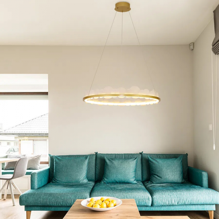 Lustre / Pendente com 03 anéis dourado Ref: 41188 Material: Metal Cor: Dourado Medida: Ø80cm / Ø60cm / Ø40cm Cabo: 150cm Possui LED Integrado Potência: 80W Fluxo Luminoso: 5600lm Temperatura de Luz: 3000K (Luz Quente) Tensão: 110/220V Peso: 6kg